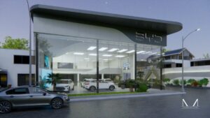 Our architectural design for the BYD showroom harmoniously blends sleek modern lines with an inviting atmosphere. The showroom seamlessly integrates contemporary architecture and eco-friendly mobility solutions. The sweeping curved roofline seamlessly transitions into an expansive glass facade, creating a striking yet welcoming presence that beckons passersby to explore BYD's cutting-edge electric vehicles within.
