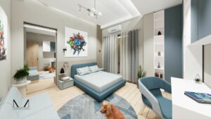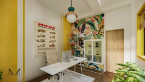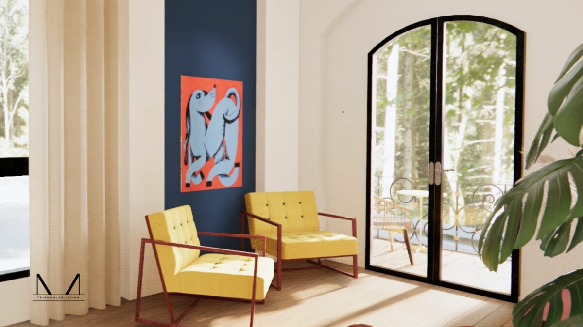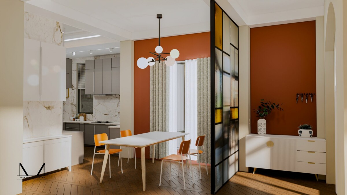 This contemporary residence is a vibrant celebration of color, texture, and materiality. Sleek wood-toned floors provide a warm foundation for the dynamic interplay of colors and patterns. The interior is a bold and playful exploration of style, featuring a rich palette of hues that infuse the space with energy and personality. The overall effect is a space that is both inviting and visually stimulating, a true reflection of contemporary living.